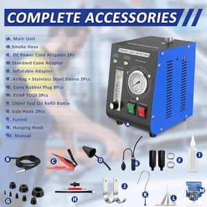 - Dual Modes: Built-in Air Pump for Fast, Accurate Results. Air Mode: Independent switch activates the built-in air pump (19 PSI pressure) to quickly identify if a leak exists via air flow sounds. Smoke Mode: Generates visible smoke (using baby oil/mineral oil) to pinpoint exact leak locations. No external equipment needed—works efficiently anywhere, saving time on diagnostics.