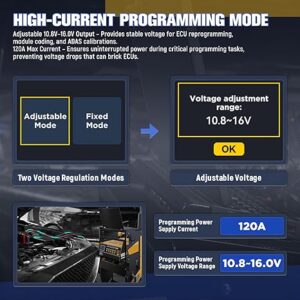 - 【High-Current Programming Mode】Delivers a stable 10.8V–16.0V adjustable output with a 120A max current (sustained for 3 minutes), ideal for ECU programming and vehicle diagnostics without voltage drops. Provides stable voltage for ECU reprogramming, module coding, and ADAS calibrations.