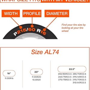 - 𝗙𝗶𝗻𝗱 𝘆𝗼𝘂𝗿 𝘁𝗶𝗿𝗲 𝘀𝗶𝘇𝗲 𝗼𝗻 𝘆𝗼𝘂𝗿 𝘄𝗵𝗲𝗲𝗹 𝗮𝗻𝗱 𝗺𝗮𝘁𝗰𝗵 𝘁𝗼 𝘁𝗵𝗲 𝗿𝗶𝗴𝗵𝘁 𝘀𝗶𝘇𝗲 𝗔𝘂𝘁𝗼𝗦𝗼𝗰𝗸 𝘂𝘀𝗶𝗻𝗴 𝘁𝗵𝗲 𝘀𝗶𝘇𝗲 𝗰𝗵𝗮𝗿𝘁𝘀 – compatible with large vehicles like commercial trucks, and buses. This model AL74 fits tire sizes: 9.00r20, 10.5r20, 11.00r16, 255/80r22.5, 265/75r22.5, 275/75r22.5, 285/70r22.5, 295/65r22.5, 295/70r22.5, 315/60r22.5.