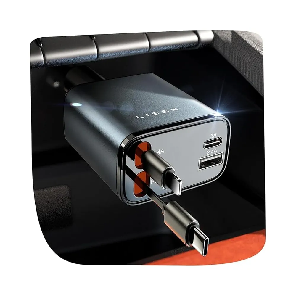 • Multi-device charging for all passengers: front or rear. The LISEN 4-in-1 car charger with 2 USB ports (USB-A 12W + USB-C 15W), a 30W USB-C and a 12W for iPhone retractable cable (up to 80 cm extendable) charges up to four devices simultaneously. Perfect for family trips or carpooling – no clutter of cables, only full performance.