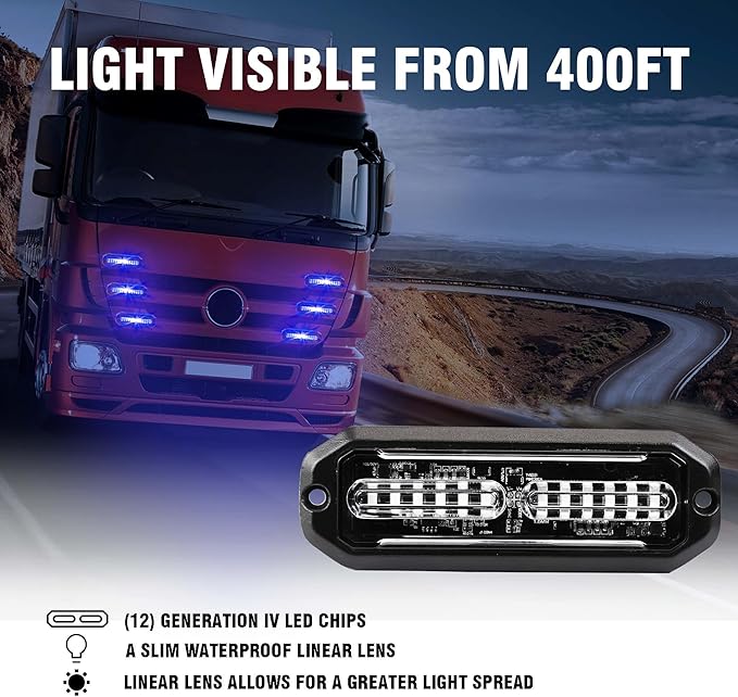 • LED Surface Mount Strobe Lights Kit: 8 pcs surface mount emergency warning flashing strobe lights for truck car vehicle 12v/24v. Waterproof LED emergency strobe lights; amber white grille strobe light combination flashing car strobe lights; 30 strobe patterns; Memory function